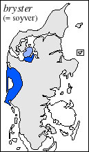 1) = rigsm. æ hår ¡uñt fu mi ¡brøst = jeg har ondt for (dvs. smerter i) brystet. $Torsted. æ brøstèr æ gal· o hiñ = brysterne er gale på hende (f.eks. ved besværligheder med diegivning). $Vroue. \ faste forb.: bryst og bringe se Ìbringe 2. _ få/give bryst = die, amme [spredt afhjemlet; syn.: patte x (forb. få/give patte)] \ (spec., i plur.:) bryster = soens yver [Hards´NØ, Fjends´NV, Hards´SV, SVJy´NV, spredt i Sall, spor. i SVJy´S; se kort; syn.: patte x (i plur.), patte·tøj]
